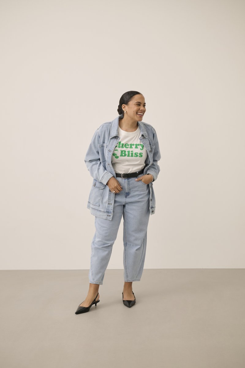Τζιν μπουφάνΔιατίθεται σε μεγθη 42–54Από τη μάρκα Kaffe CurveΥλικό: 98 % βαμβάκι, 2 % ελαστάνηΦαρδιά γραμμήΤο χρώμα είναι μπλεΚάντε κλικ εδώ για να δείτε τον οδηγό μεγεθών