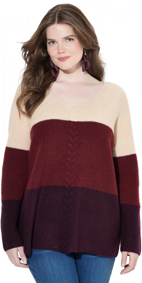 Οδηγός μεγεθών - Ulla Popken Cable Knit Block Stripe V-Neck Sweater Dark Ruby